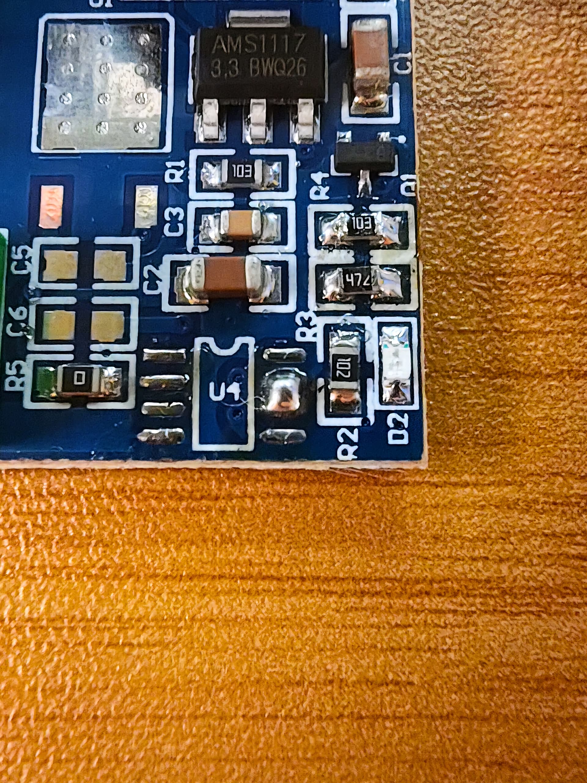 Swap R3 and R4 (the 3.3V output by ESP-01S is not enough to drive the transistor fully on with 10K in series and 4.7K to ground, but it works fine if 4.7K in series and 10K to ground instead, so swapping is the simplest solution without needing any more SMD resistors)