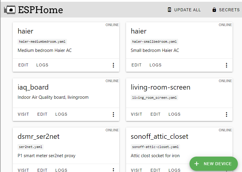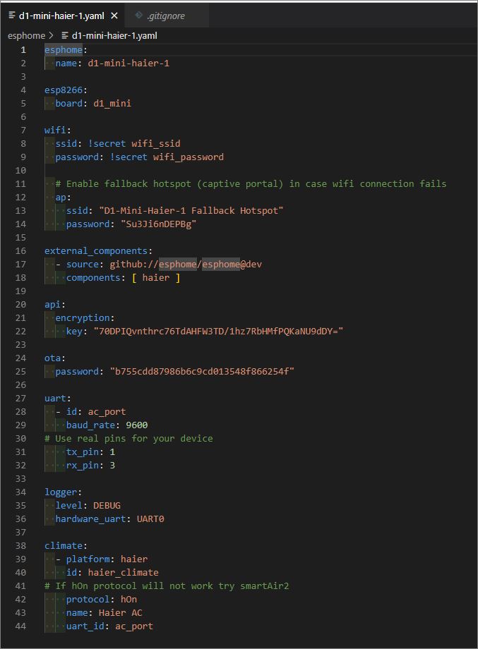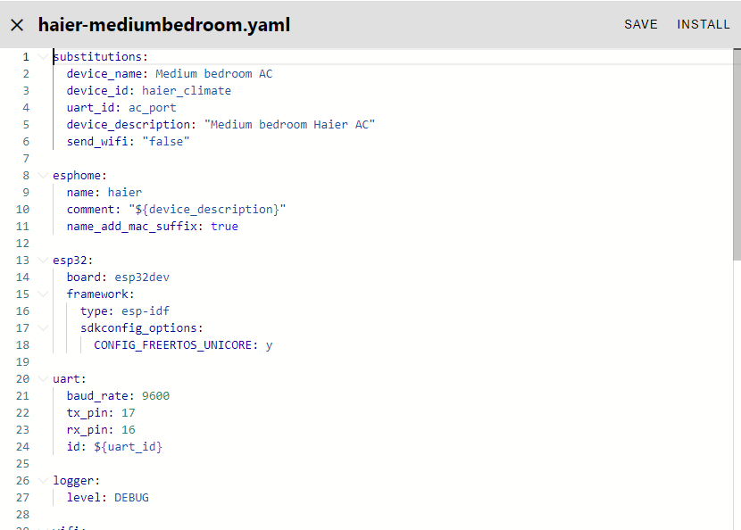 I installed the ESPHome add-on in Home Assistant and added the new device (Wemo D1 mini) using a USB cable. After this I soldered a cut USB cable to the Wemo and plugged it into my Haier. The Wemo shows up as “online” in the ESPHome Dashboard. So far so good.