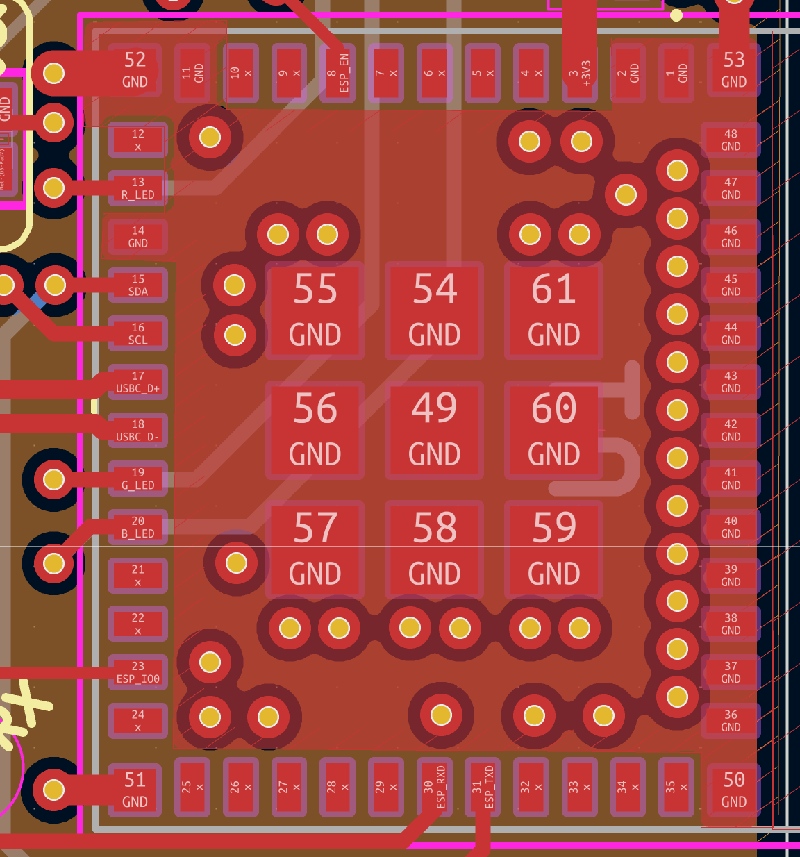 The enclosure where the dongle needs to go is quite tiny (56 x 34 x 9 mm) which constrains a lot the design. That’s why I decided to use a ESP32-C6-MINI-1-H8 for its small size.