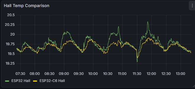 I’m measuring to two decimal points and I get a repeatable uplift in temperature displayed on the ESP-C6 when compared to the ESP32 of