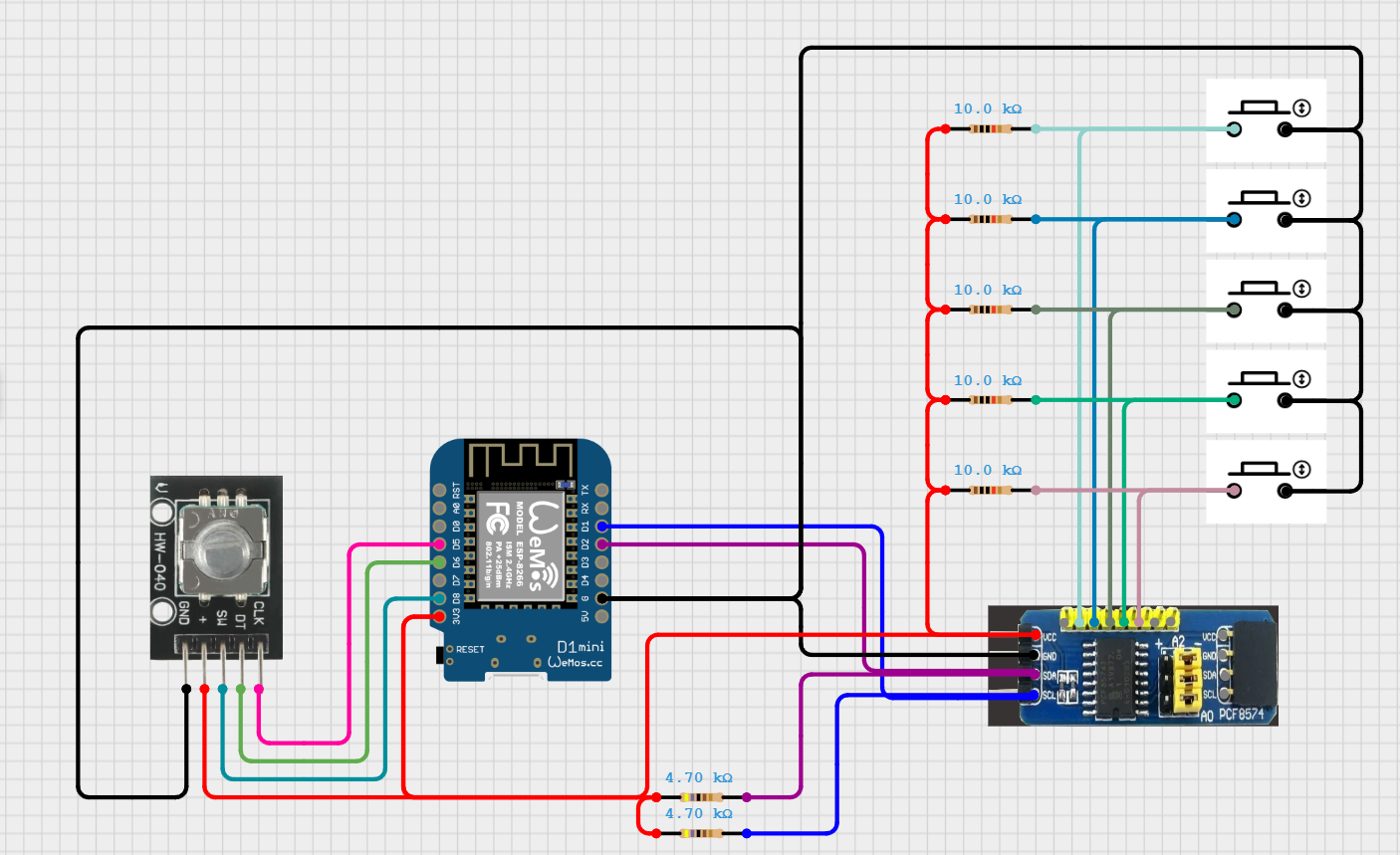 The other way to do it is to put the resistors in the same place (on the pcf8574 side of the button) but have the other ends of the resistors connected to ground. Then have the buttons connect to 3.3V instead of ground. That way you won’t need inverted: true. There’s not really any major advantage of doing it one way or the other.