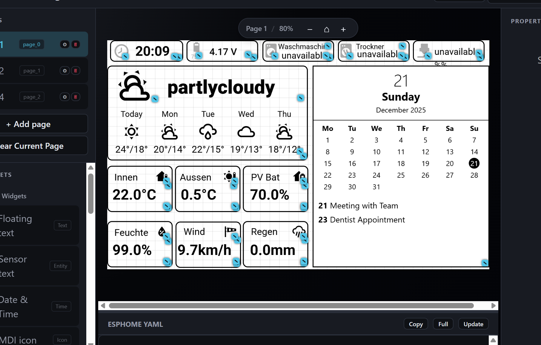 Thank you for the kind words. The next version does not need to be installed on HA at all, it can be deployed like thi ESPHome Designer ยท YAML Snippet Editor and you can just enter the HA API key to have access to all your sensors, so that is definitly next for the project