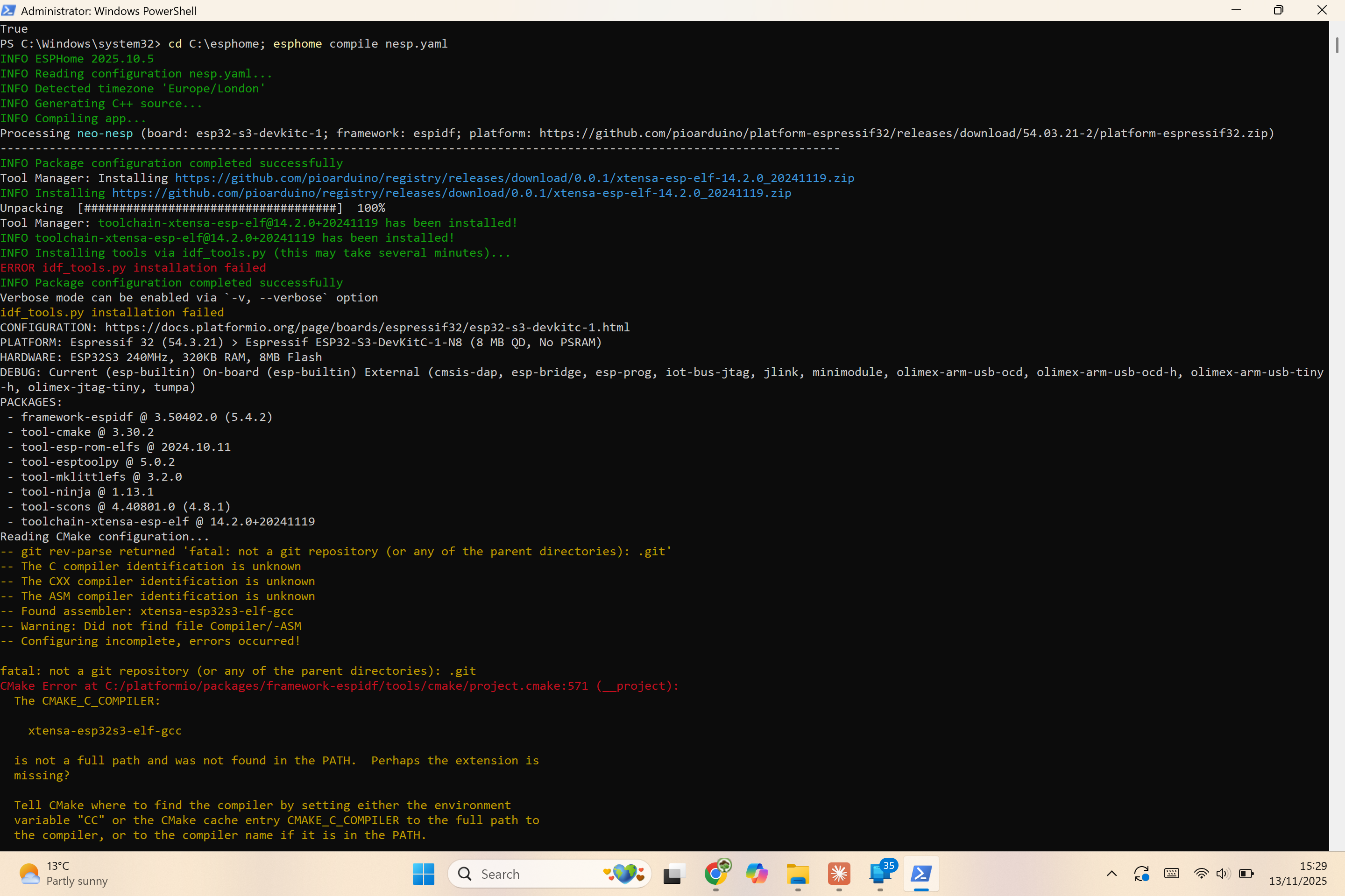 The issue appears to be specific to ESP-IDF tools download, not ESPHome installation itself. Has anyone successfully compiled neo-nesp (or any ESP-IDF based ESPHome project) on Windows recently?