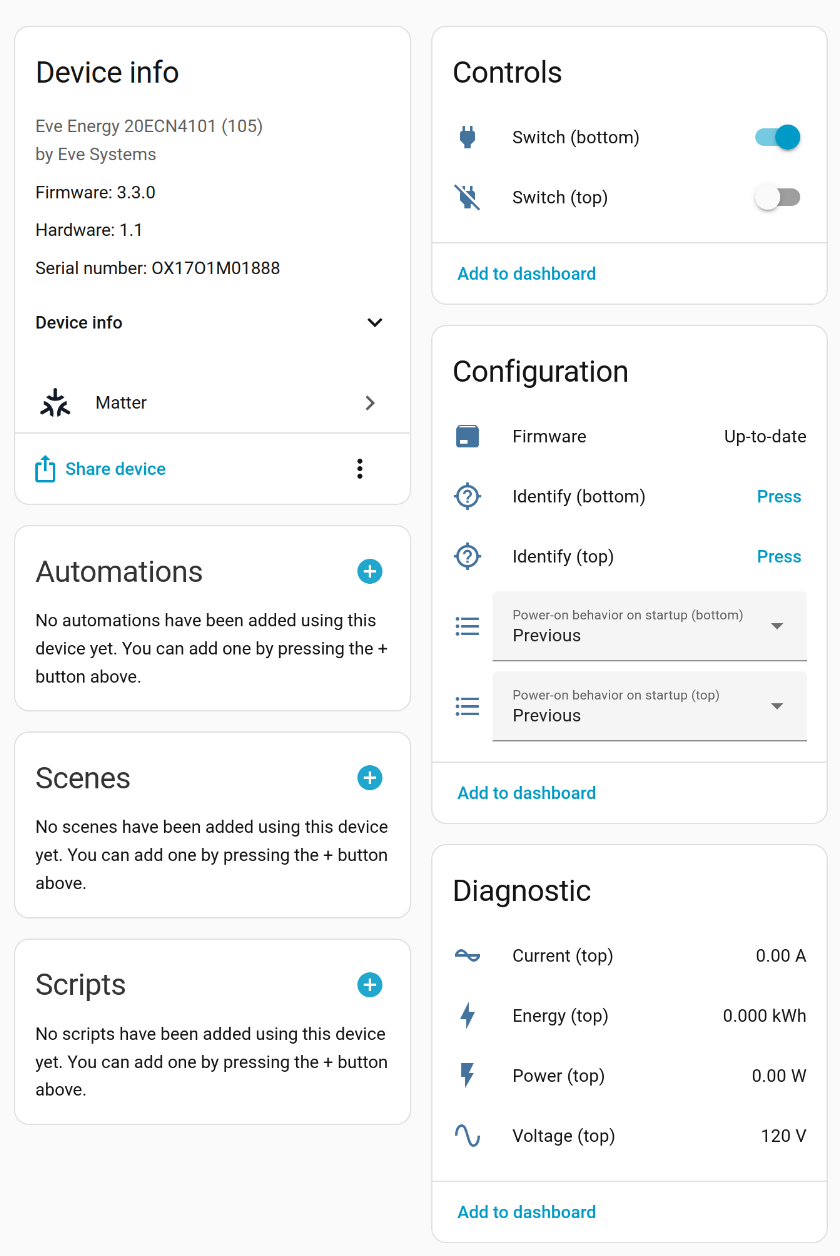The energy monitoring seems to be accurate when testing with a pigtail plugged into a Kill-a-Watt monitor. Both outlets contribute to the energy readings despite them being added with “(top)” in the name. The outlet itself draws about 0.4w. The reporting of energy statistics seems to be limited to every 30 seconds with no options to change the polling interval. I’d prefer there to be an option to push the power usage based on a percent change threshold to facilitate use as a trigger for automatons. 30 seconds is too long to trigger an action when say a device is turned on.