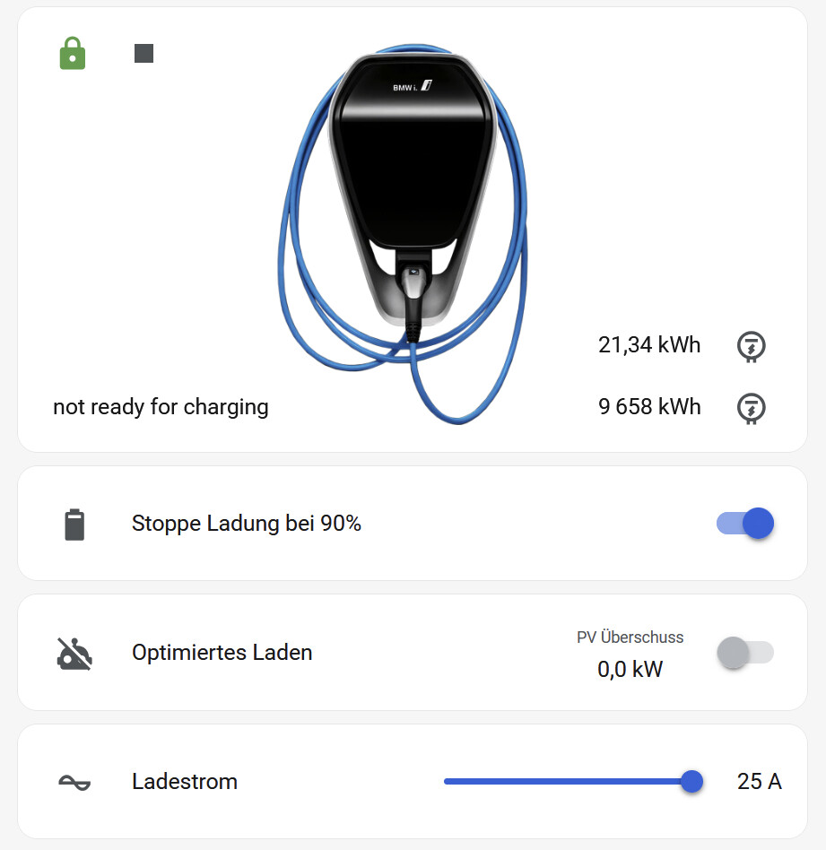 I have some automations and helper entities to calculate available surply PV production, control charging and stop charging when reaching SoC 90%. Depending on my âcharging modeâ and status of the charging station, different options are shown. During active charging, the UI changes as well, including the active charging power. Once the EV is plugged in, the cable is ârolled outâ ![]()