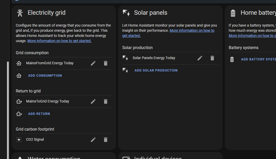 I created two groups (helpers) where I’m summing daily consumption and I’m using these as “Grid Consumptions”