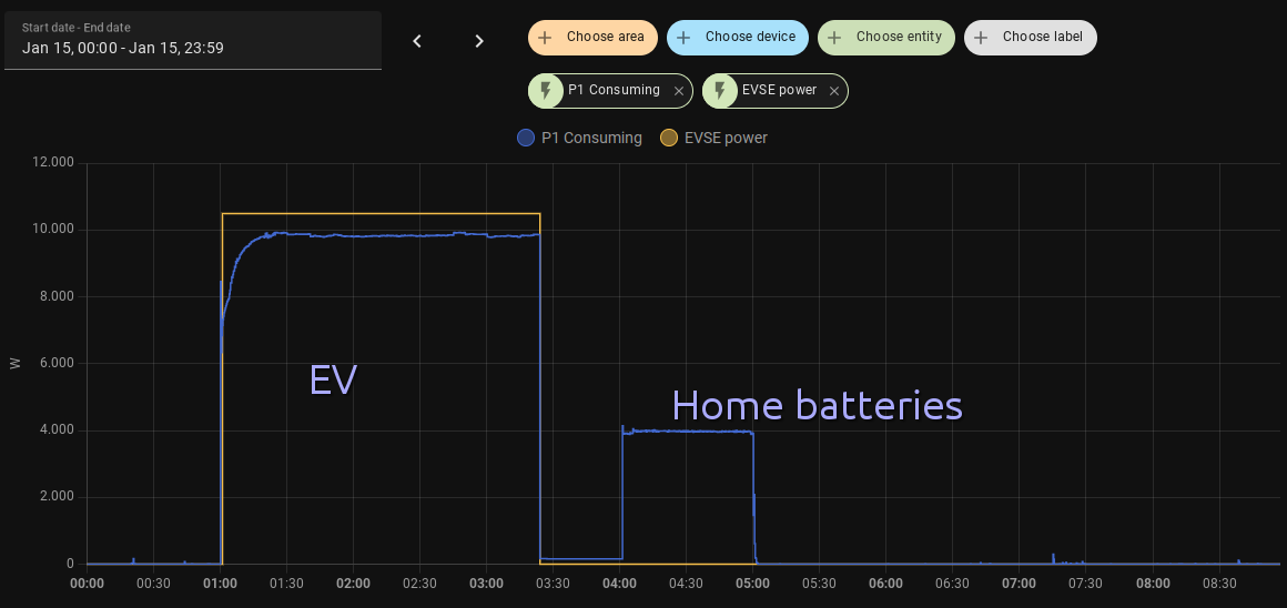 This is my consumption last night, including our EV (and later home batteries). The EVSE power is a phantom power device that reports the default EV consumed power when the charger is ‘on’. It is a little bit of to reality, but not much.