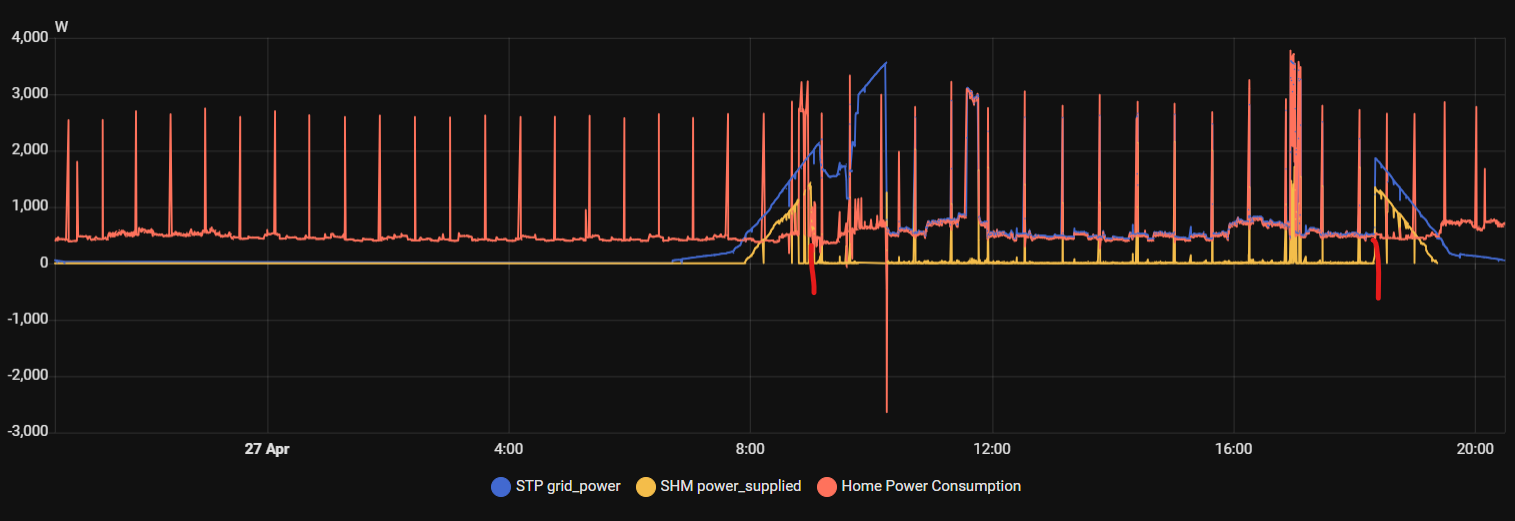 The graph below shows the effect of limiting the power at the grip point to â0â [W] (between the red times): the inverter modulates the power (blue line) to match the house consumption (red line). The power supplied to the grid (yellow line) stays at zero for most of the time, only some small transients due to the cooker boiler heater spikes. (Missmatch at the start is due the the heatpump consumption not shownâŚ)