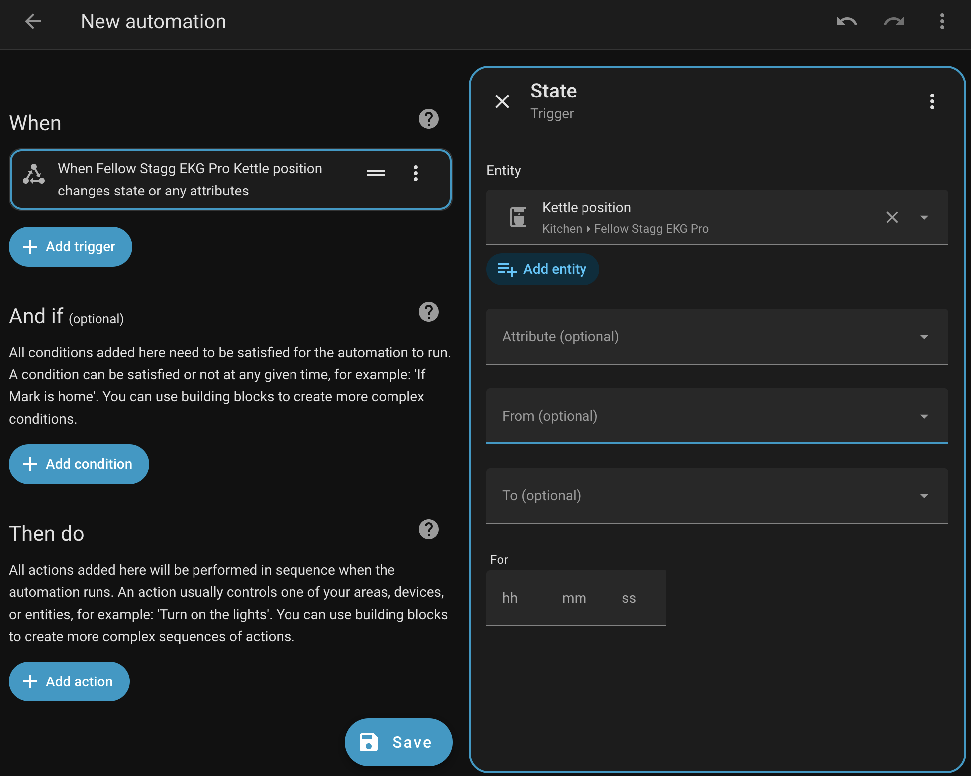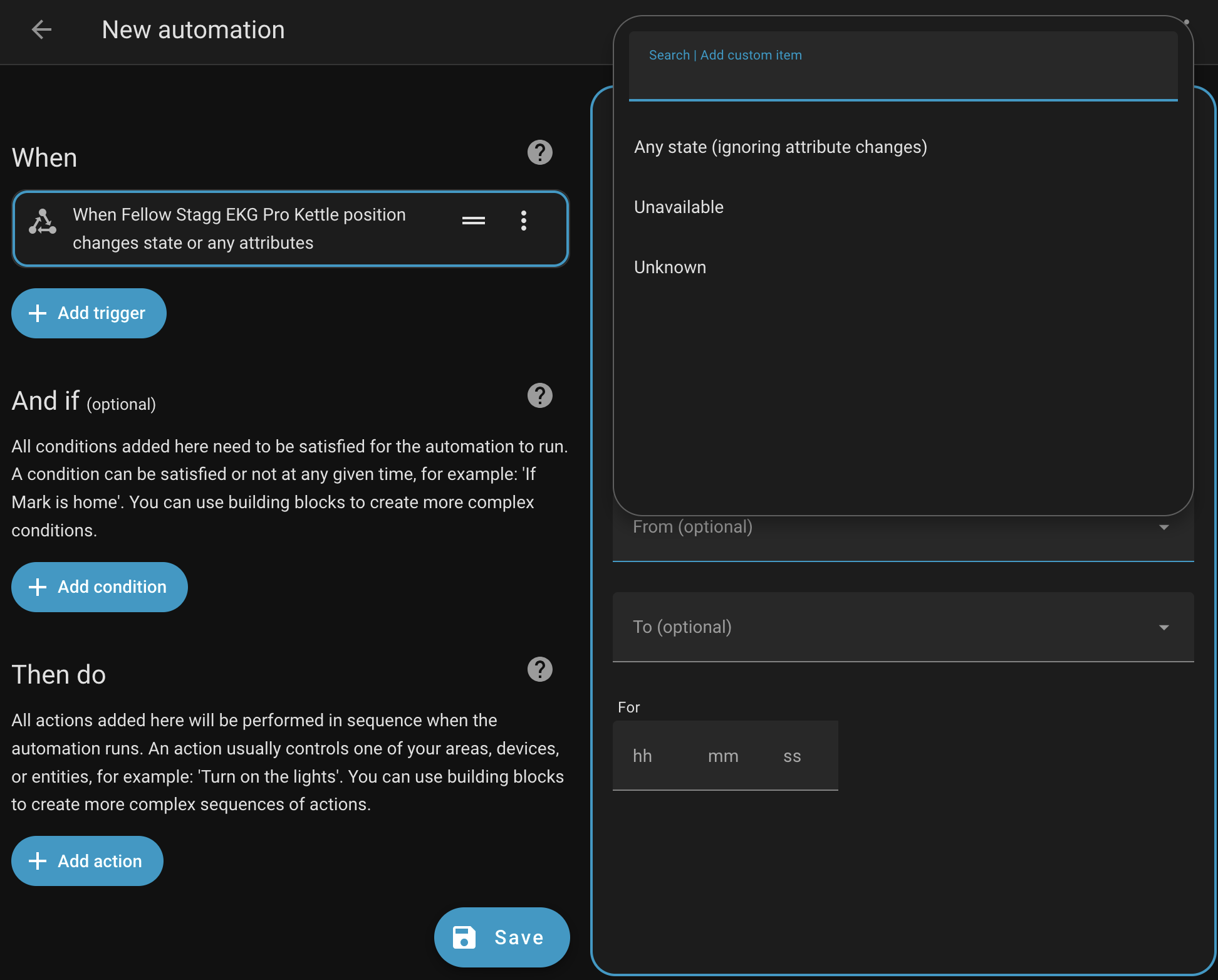 The second is when using the kettle position entity state. The options for the states are Any, Unavailable, and Unknown. It would be great if the available states for On base and Off base were listed there.
