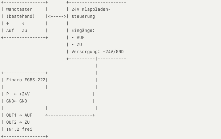 I’d like to add a Fibaro Smart Implant (FGBS-222) in parallel with an existing 24 V momentary wall switch that controls my shutters. The wall switch currently takes a 24 V supply and, when pressed, sends 24 V to terminal 2A (open) or 2B (close).