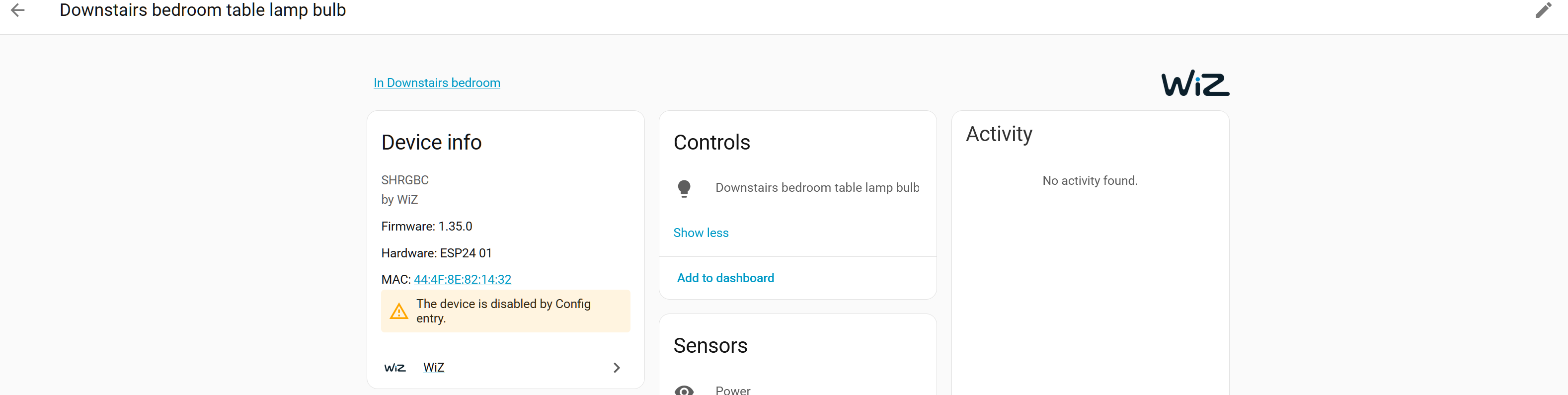 It shows as “WIZ RGBW Tunable 821432” in the “Integrations / disabled” screen, but shows as “Downstairs bedroom table lamp bulb” when I filter by “Integrations: Wiz”, include : “Status: disabled”, add the “Status” column to the columns, and sort by the status column.