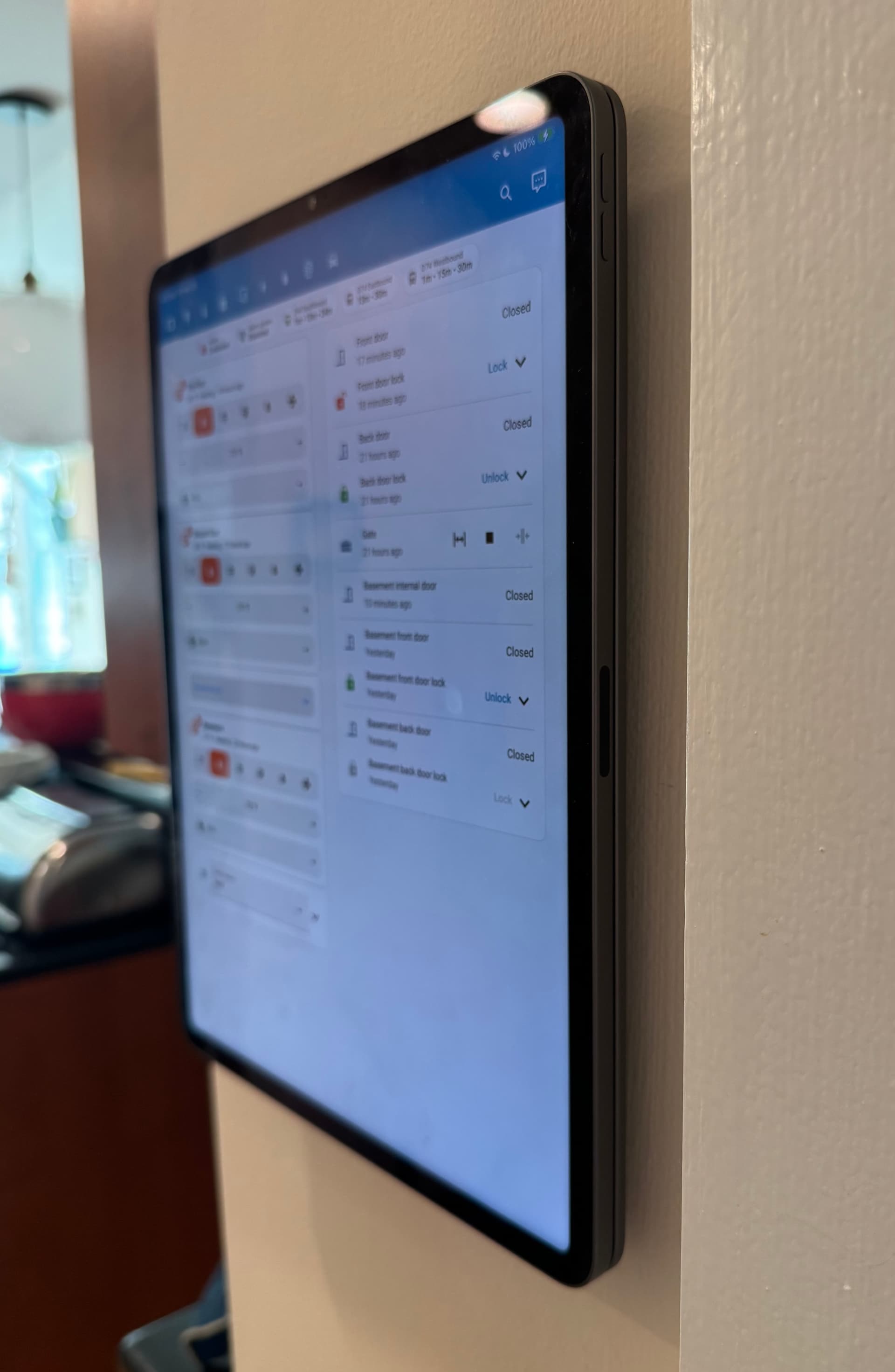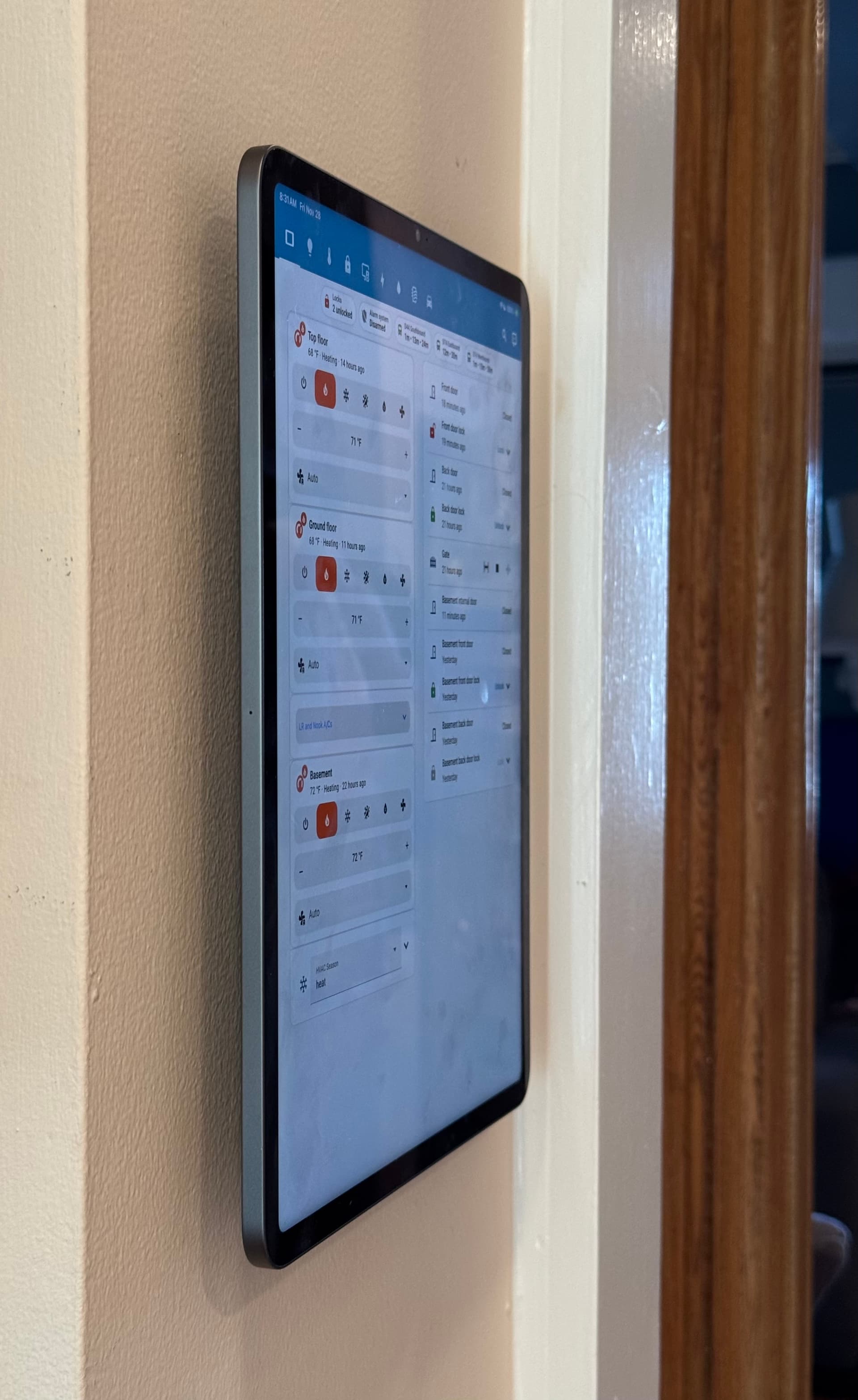 This is a big upgrade from my previous wall dashboard, which was an iPad mini semi-permanently stuck to the wall and with a wire going into the charging port. Ugly!