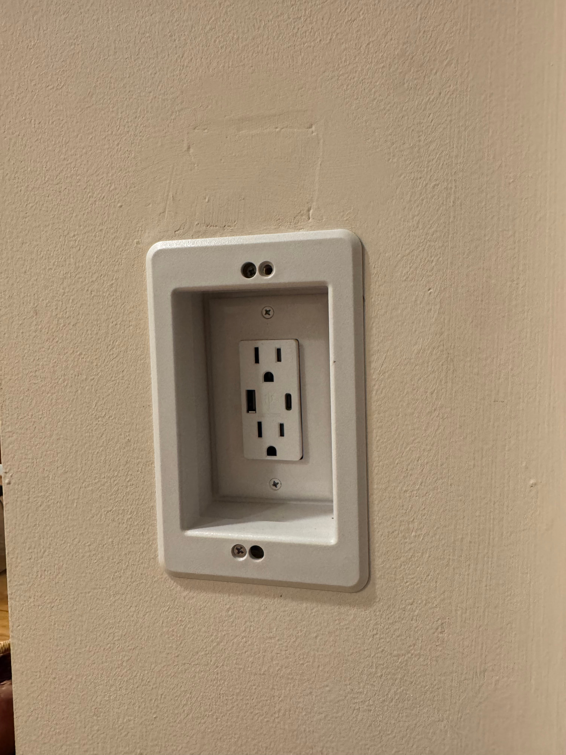 I installed this recessed outlet box with an outlet that has USB-C, running Romex wire to it from a nearby light switch. (As some of the reviews say, the box has some badly sized screw holes. This can be addressed by pressing in some threaded inserts with a soldering iron.)