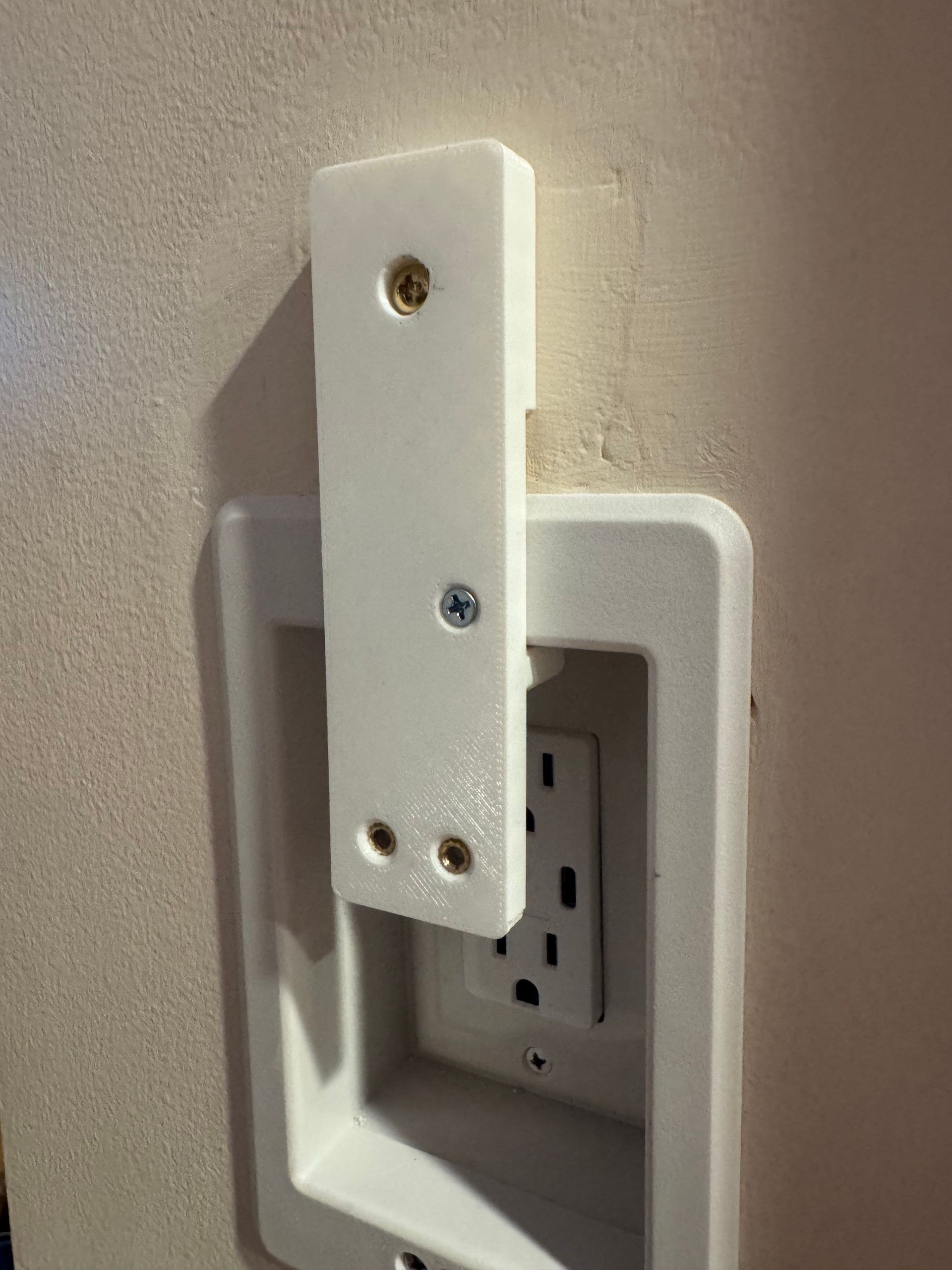 I 3D printed a bracket (Onshape file here), screwing it into the outlet box and the wall, again using threaded inserts where the Kuxiu mount will go. This bracket isn’t really necessary—you could forgo reusing the screw holes in the center of the Kuxiu mount and just put screws through the outside of the mount in 3 or 4 places.