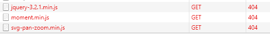 Those 404 errors in the second screenshot indicate that the browser cannot load the javascript files from the web server.