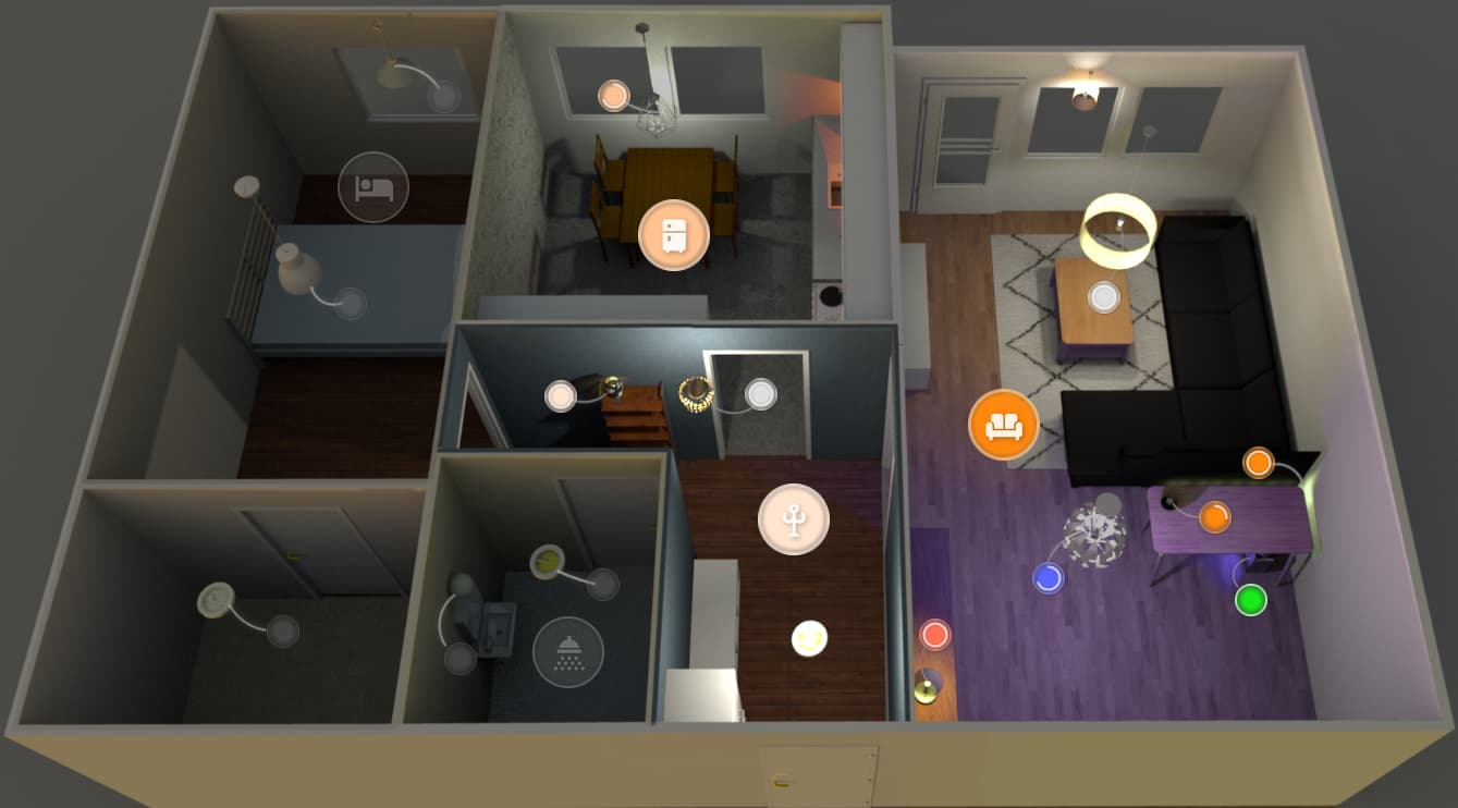 This is my implementation so far! I went to great lengths to find light fixture 3D models, so I just couldn’t cover them up with buttons. Instead I made smaller indicator buttons for individual lights and added lines to connect them with objects. This also helps keeping things separated around my desk area, while buttons are still large enough on my tablet. Also tweaked the room buttons and added a toggle for my PC.