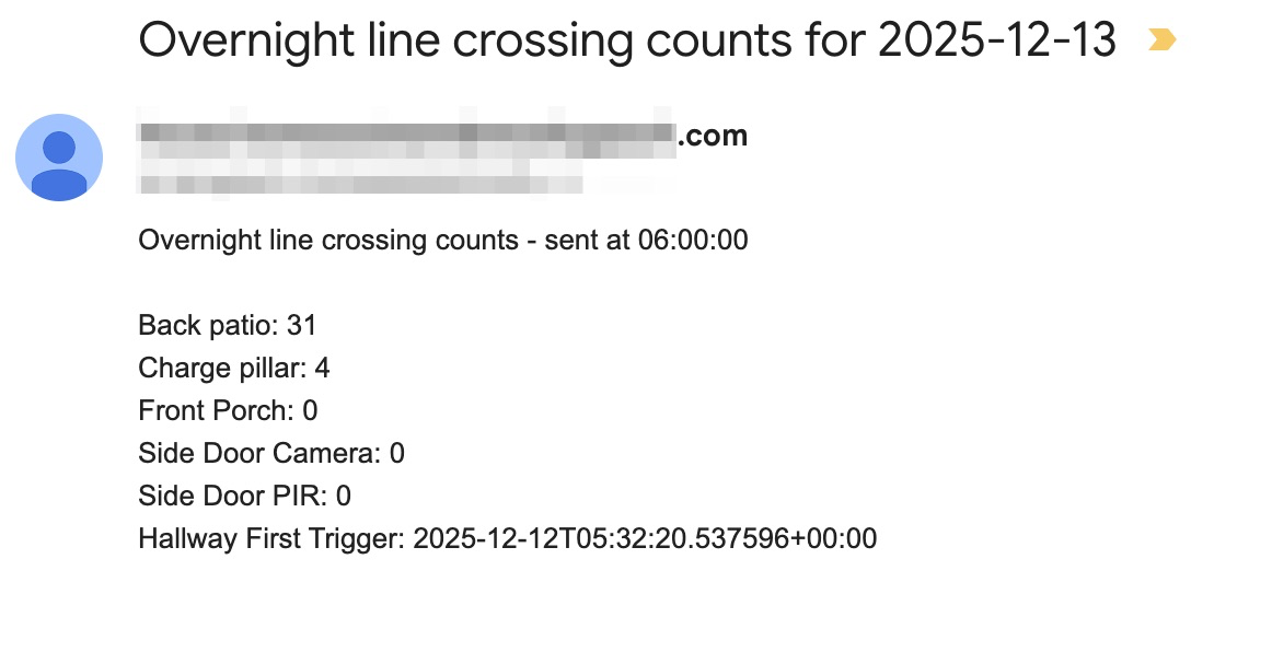 Overnight line crossing counts - sent at {{ now().strftime('%H:%M:%S') }}