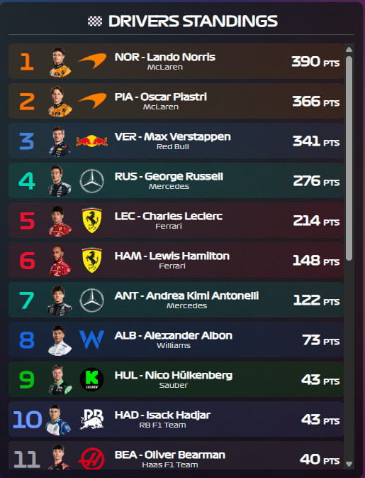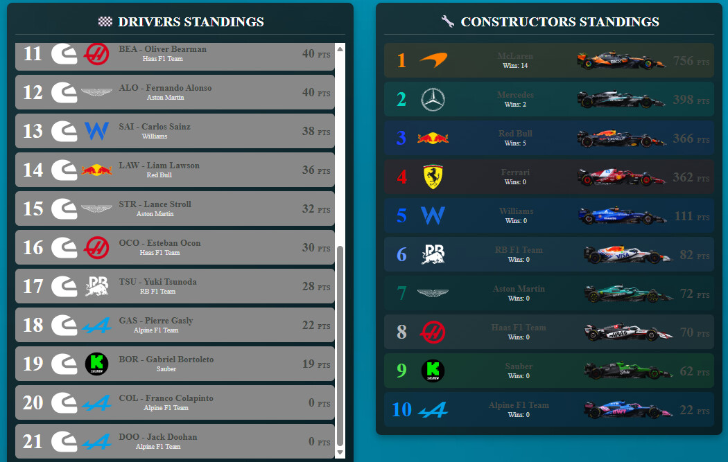 LE: noticed an error in the Drivers list… Tsunoda’s and Lawson’s teams are wrong. Swapped. ![]()