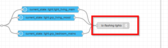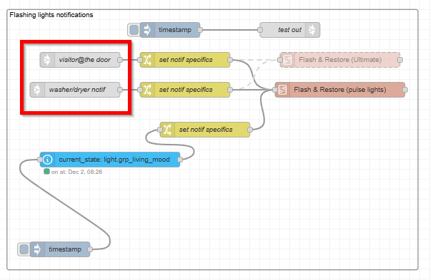 Example of how I have it for multiple notifications (washer/dryer done - flash blue 5 times 250 ms delay, Doorbell - flash orange 5 times 100ms delay etc). Flows that trigger the behavior are across multiple flows (tabs), connected with “link in” and “link out” nodes.