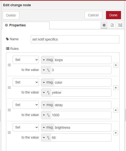 [{"id":"61606816fabfa160","type":"change","z":"520ea6df5c7e3826","g":"dd05c61da726fb2c","name":"set notif specifics","rules":[{"t":"set","p":"loops","pt":"msg","to":"3","tot":"num"},{"t":"set","p":"color","pt":"msg","to":"yellow","tot":"str"},{"t":"set","p":"delay","pt":"msg","to":"1000","tot":"num"},{"t":"set","p":"brightness","pt":"msg","to":"66","tot":"str"}],"action":"","property":"","from":"","to":"","reg":false,"x":430,"y":2380,"wires":[["ee0ac9f830805ed9"]]}]