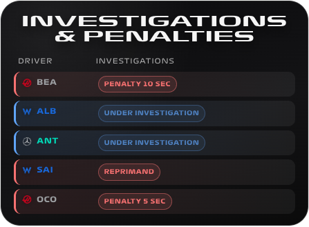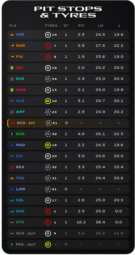 • Team Radio, Pit Stops, Current Tyres, Top Three, Sprint Results, FIA documents, and more