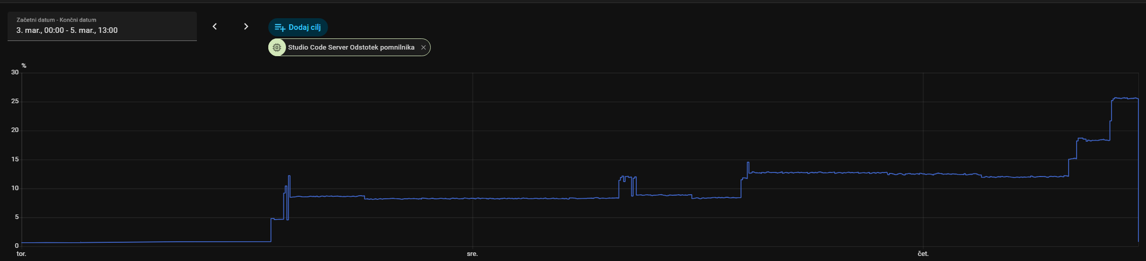 Just for info: VS still IS a memory hog, it’s not resolved. I disabled nightly addon restarts a few days ago and this is the result (drop at the end is because i just manually restarted it):