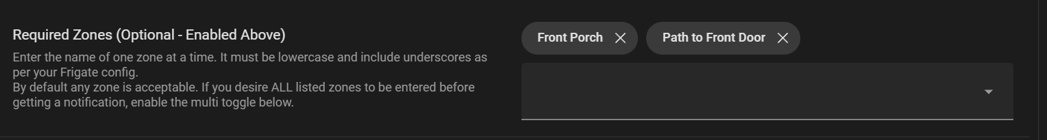 I prefer to use the alerts by zone kind of setup using frigate directly. But it should still work the way you are trying it. Have you tried putting them lowercase with underscores as per the description for that zone filter.