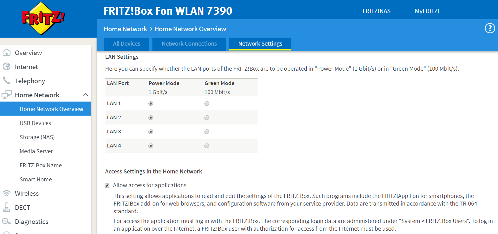 The setting is found in “Home Network” -> “Network Settings” and it’s called “Allow access for applications”