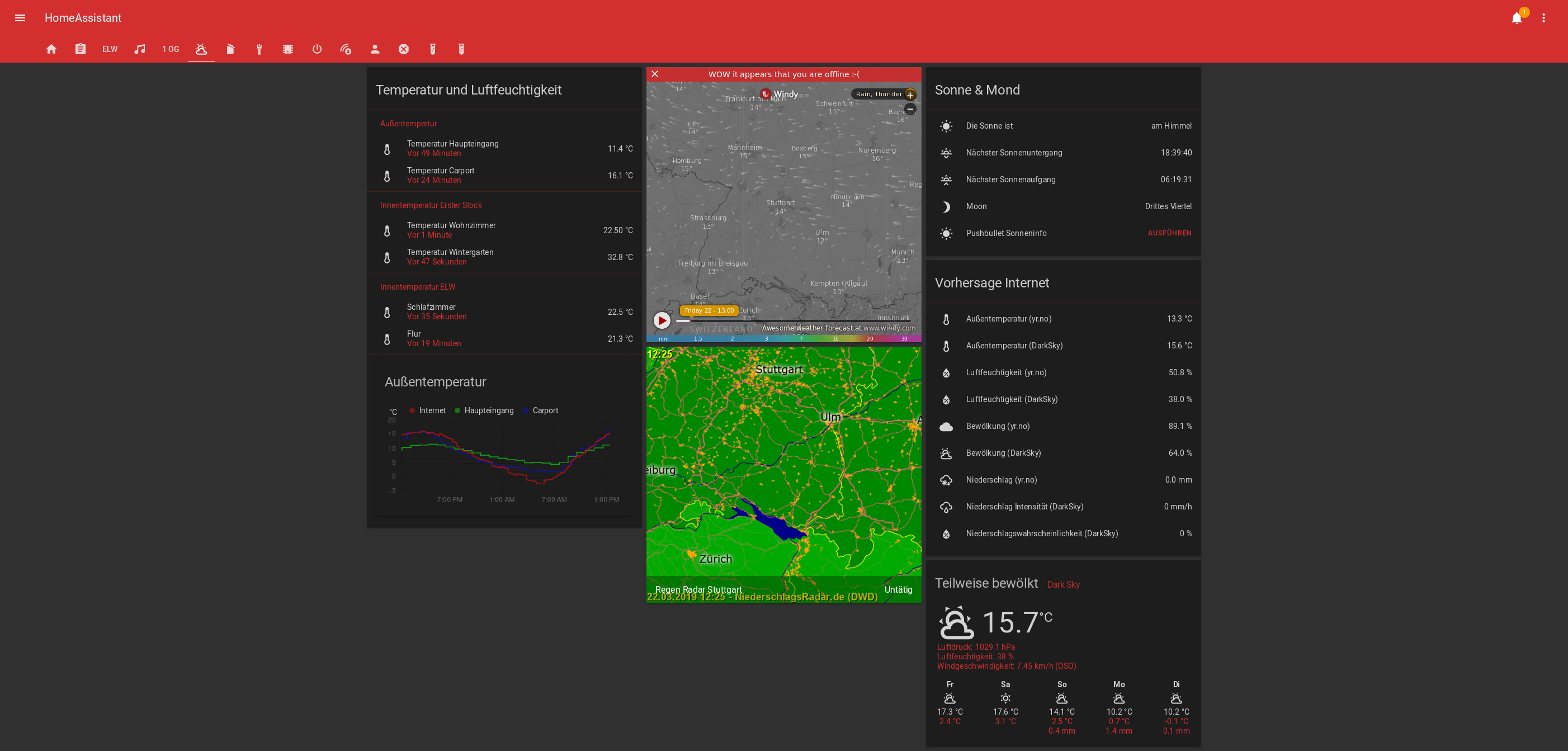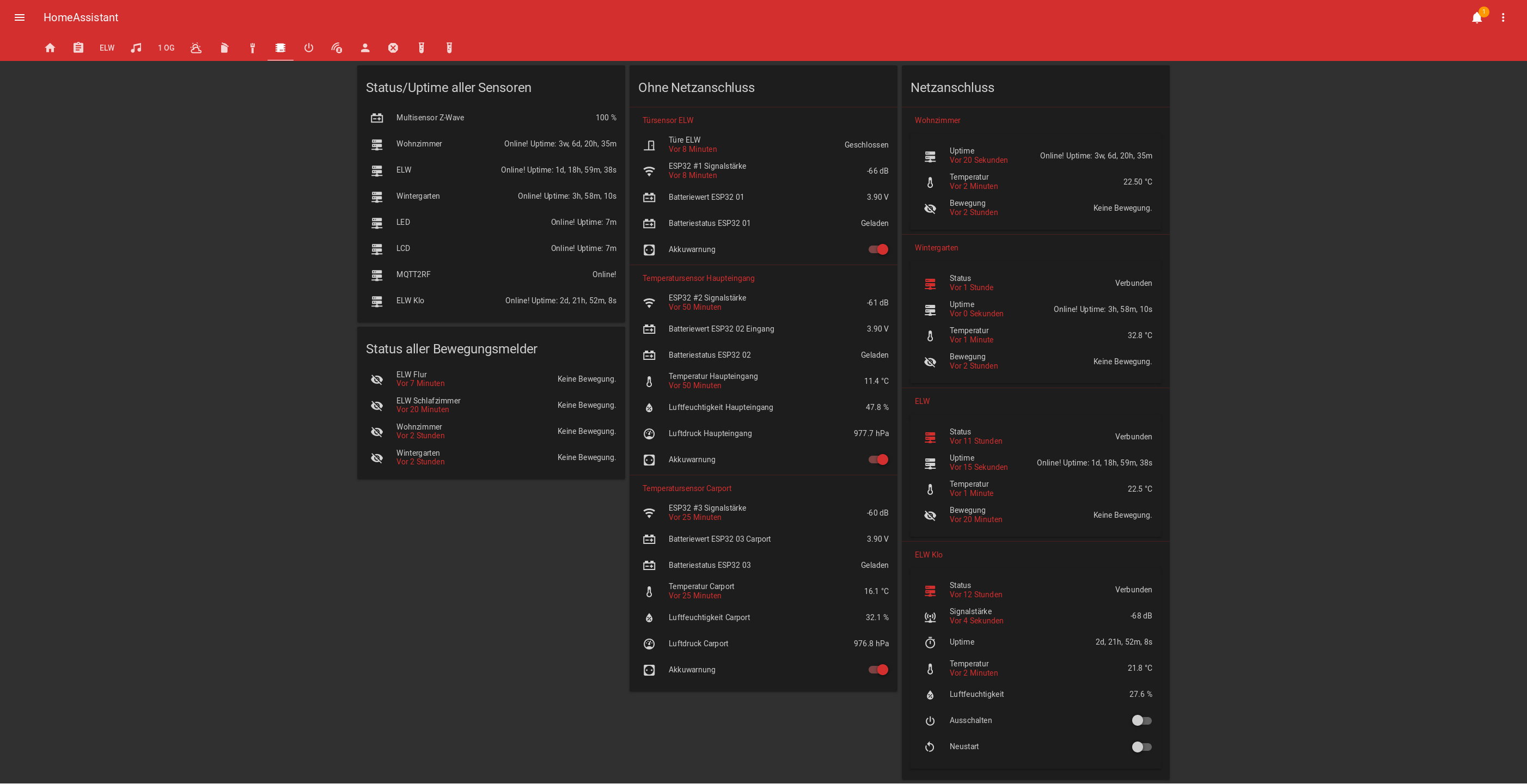 I played around with conditional cards to filter information (e.g. “Update HomeAssistant” only appearing when there is a version mismatch or dynamic cards when a device is on- or offline…) and stacked additional information in foldable rows. Most of the graphs used are “dynamic” with a time range defined in a input_select.