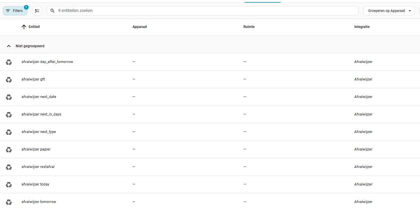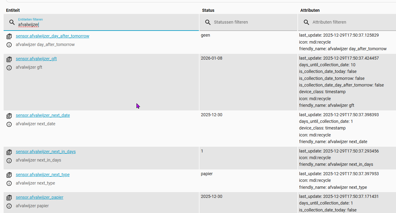 Another option is to check the enitites, maybe you ended up with additional entities and or entities with different names you used to have. Search for “afvalwijzer” in de developer section → states.
