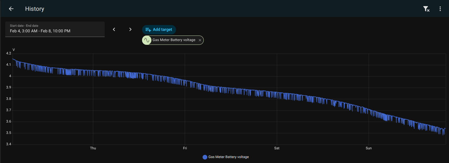 I have it running for 113 hours using Wifi. The battery has drop from 4.16v to 3.54v so far. That’s 0.0054v per hour. Assuming the voltage will keep dropping at a similar rate, that means the 4000mAh battery will give me 8.8 days with the current configuration.