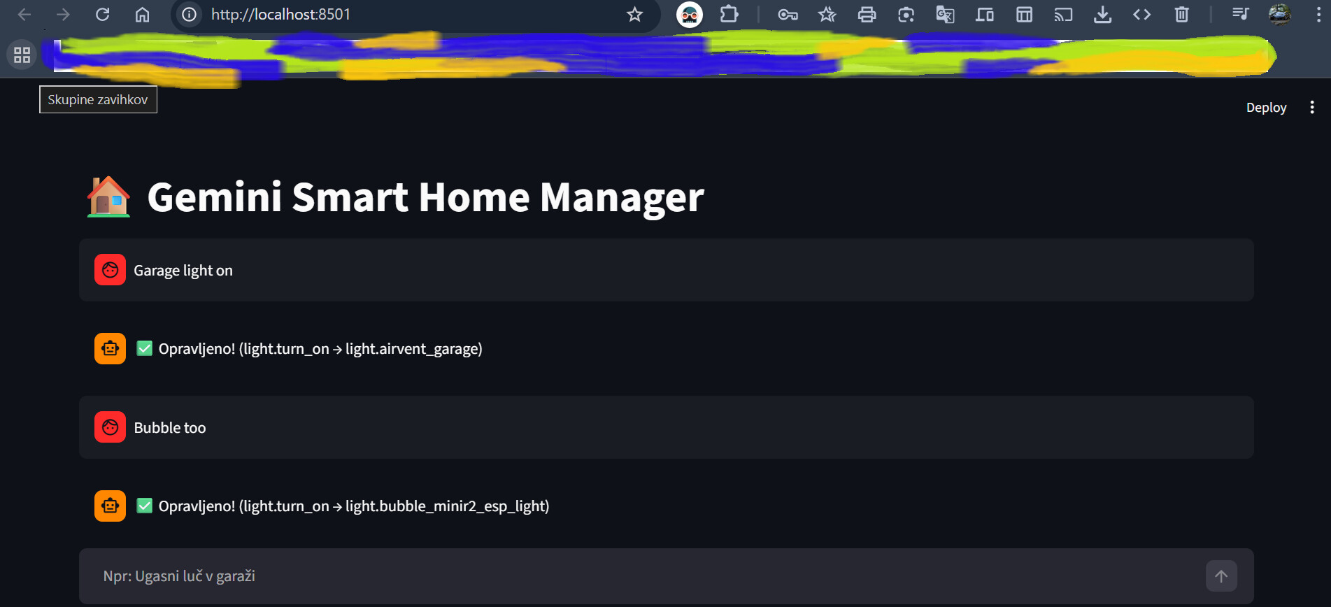 light.garage_main). - Smart Filtering: It intelligently filters out thousands of technical entities and sends only the relevant ones (lights, switches, climate) to the LLM, ensuring fast and accurate responses.