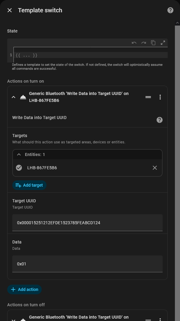 I have attached the screenshots from the Bluetooth sniffer app (LightBlue) you can see there are alot of what I think are called “characteristics” (in Screenshot 3) for this device and I know that if I write to the one called “0x1003” which the app tells me is UUID 1003 (in Screenshot 4) then it changes the temp on the radiator. From the screen shots you can see that the value for this characteristic is “0x0015” for 21 degrees Celsius and “0x0017” for 23. I know those values “0x0017” are Hex values and in the app I can display different formats for the characteristics and the format that displays the value in Celsius is called “2 byte Unsigned Int Little Endian”(in Screenshot 5) I am abit confused as to what to put in the “data” field in your integration and any help on this part would be appreciated.