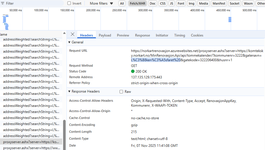 Some information is required to make the API call. Open developer tools in your browser and go to the Network tab. Navigate to ROAF Hentekalender and enter the address you wish to get the garbage collection days for. In the Network tab you will find a bunch of requests to proxyserver... click on the first of these.