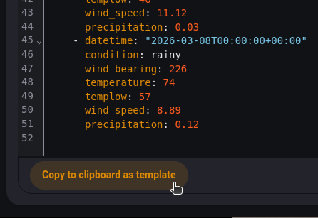 I then setup an automation to run the weather.get_forecasts action on that entity and store it in “daily” from the way I understand it so far: