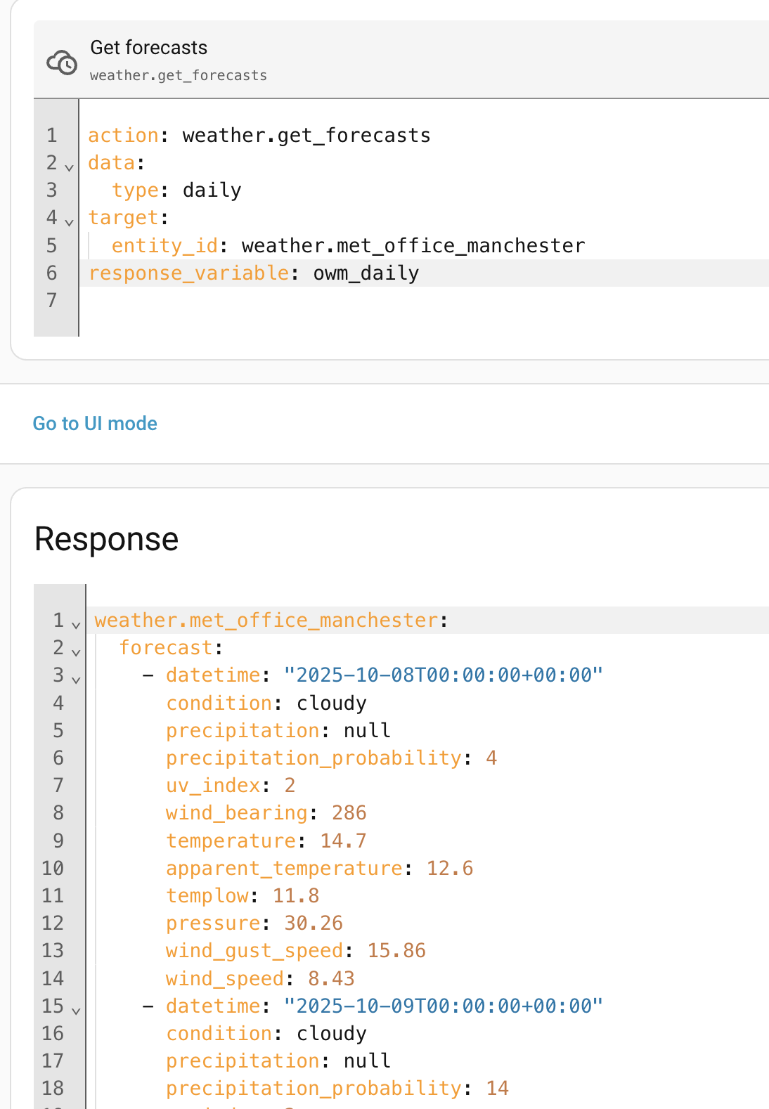 Change the above weather entities and variable names to suit your needs, obviously. You can also set it to pull Hourly forecasts if your weather integration supports it, as well as Day/Night. Personally I pull all three into attributes called “daily”, “hourly” and “daynight” then I’m covered on all bases.