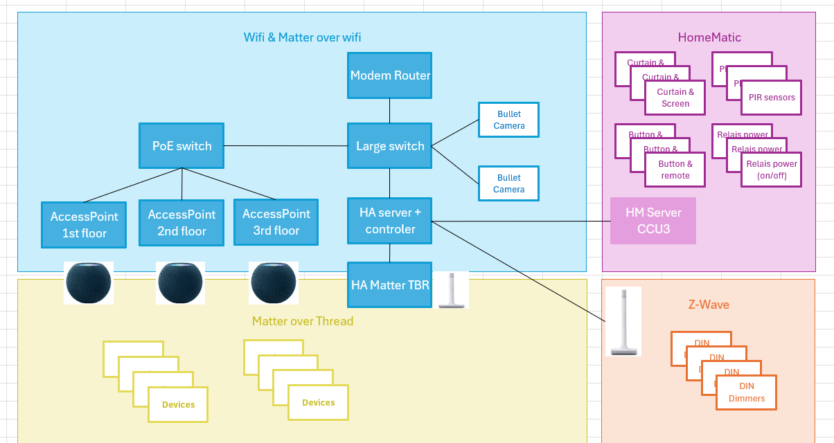 Our house has quite thick concrete floors, where one central Wifi point simply doesn’t work. So we’re using 3 Ubiquiti access point (one on each floor). Despite the Wifi challenges, all HomeMatic (868mhz) devices worked flawless with the server in the electrical cabinet downstairs (there are no HomeMatic devices on the top floor, so I don’t know if the HomeMatic signal would reach there).