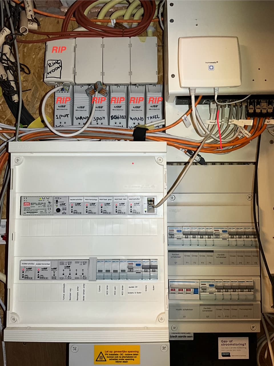 Most HomeMatic switches are inside a central cupboard downstairs. The light switches on top are almost all dead (on the picture marked: RIP). The DIN rail switches (mostly screens & lighting outsite) still work fine.