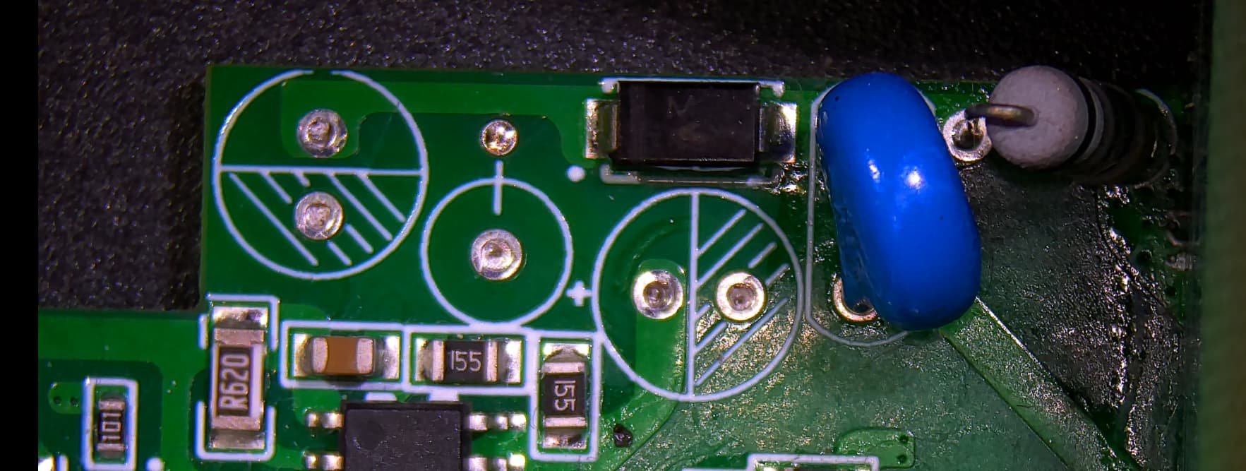 The PCB clearance distances between the high-voltage supply section and the low-voltage Zigbee circuitry measure approximately 1.3mm at the electrolytic capacitor pads — well below the 3mm minimum required for basic insulation through air at OVC III per IEC 60664-1. The creepage distances along the PCB surface are correspondingly short, falling well under the 4mm required for basic insulation and far below the 8mm required for reinforced insulation for FR4 material group IIIb at this installation category. While inadequate clearance creates a direct arc risk through air under transient overvoltage, it is the creepage path that becomes the dominant hazard under real installation conditions.