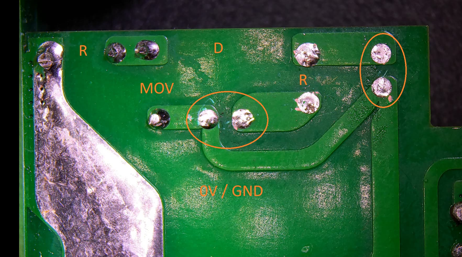 Picture of the bottom side of the DC rectifer on the PCB: