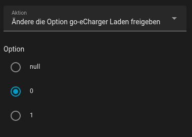 Start charging works great with “Ändere die Option go-eCharger Laden freigeben” to “1”.