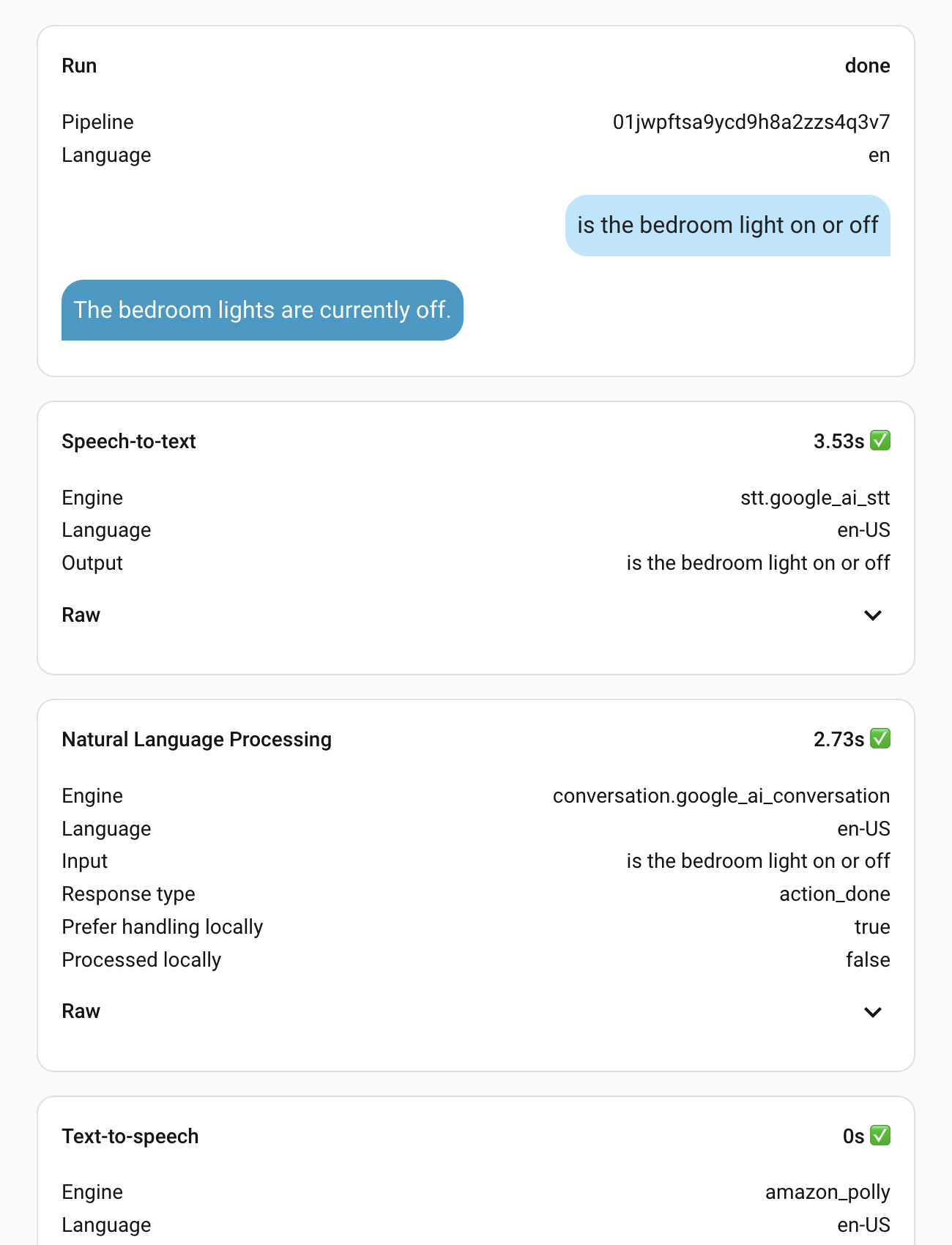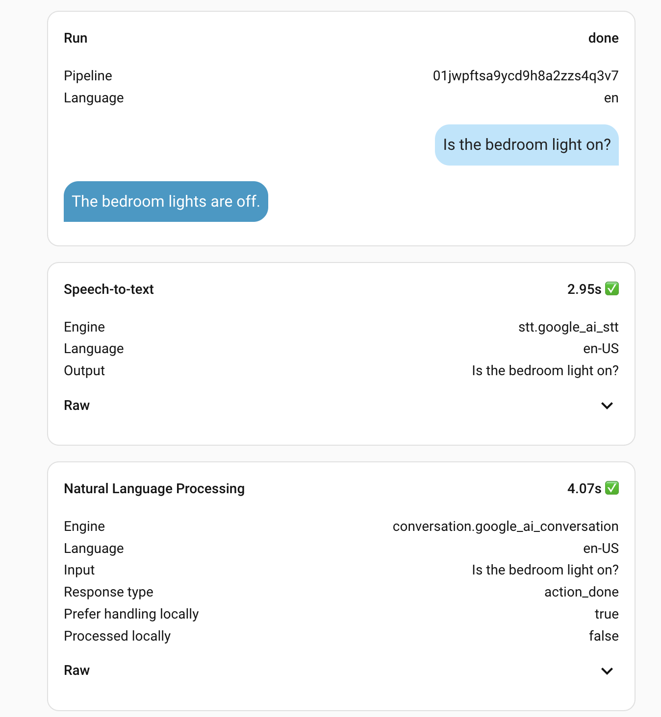 Just got my HA voice hardware and started to play with voice assistant. I’m using Google Gemini AI as the STT and NLP engine. However, I often have to wait for nearly 8~9 seconds to get the response. The debug shows that STT takes ~3 seconds and NLP takes 3~4 seconds.