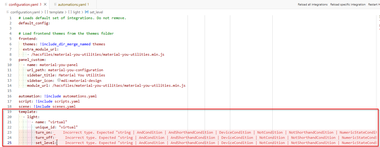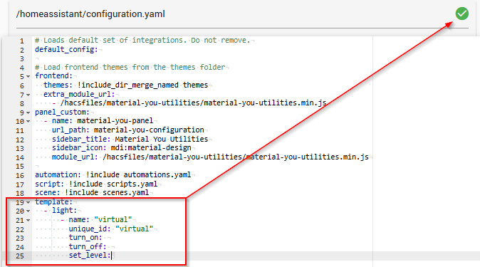 configuration.yaml. Note: You cannot use the Helper UI to create this light because the UI does not support creating a template light with the custom brightness settings and empty service calls required for this routing logic.