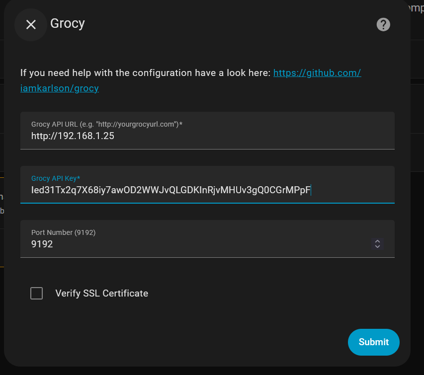 Looking in the HASS Core logs I’m getting the error “Failed to establish a new connection: [Errno 111] Connection refused”. I’m not seeing any errors in the Grocy logs.