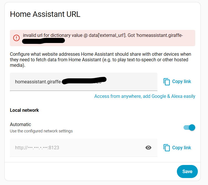 To simplify, let’s use IPv4 format in both of the URLs. So not 100.xxx-yyy.ab.net nor homeassistant.xxx-yyy.ab.net nor 192.168.1.ab.net. Only 4 sets of numbers; no alphabet.