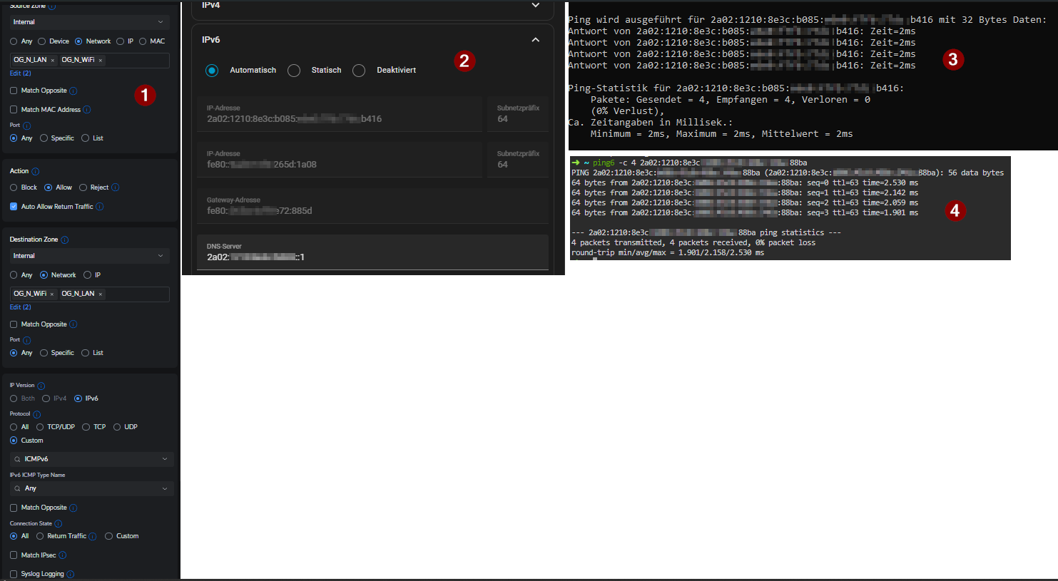 setup: unifi udm, 2 vlans (wlan - home assistant companion app, lan - home assistant itself), which have ipv4 inter-vlan routing allowed. furthermore ipv6 inter-vlan routing allowed (any types). (see 1)