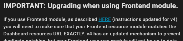Make sure Dashboard Resource URL and Frontend module URL match. Always restart Home Assistant after updating Frontend module URL. The good news is that once you have done this with v4, and no v3 code remains in cache anywhere, v4 will handle double running code and ignore any duplicate patching. However its best to follow the recommendations on matching URLs.