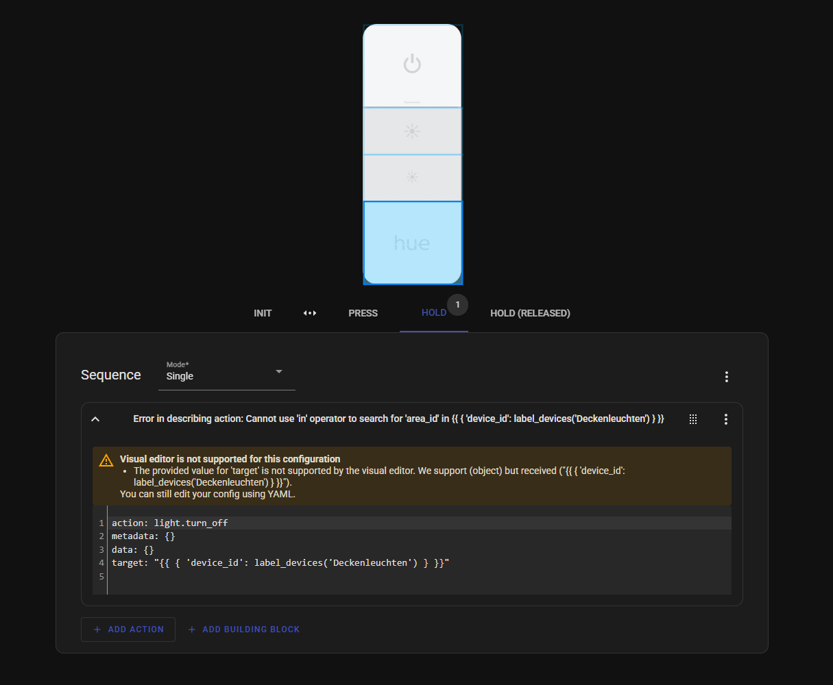 I want to replicate the original Hue behavior: a short press turns on the lights in the dimmer’s area (e.g., “Lab”), and holding the Hue button turns off all lights in the home.