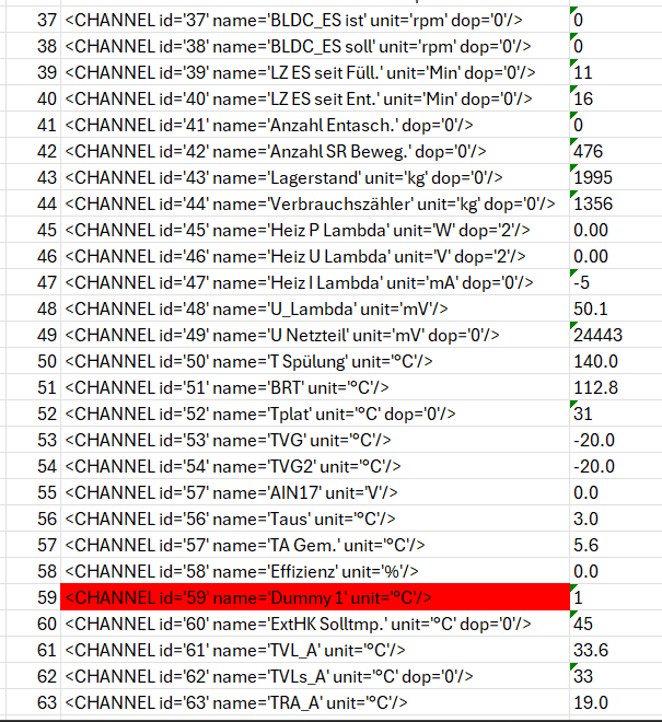 `"<DAQPRJ><ANALOG><CHANNEL id='0' name='ZK' dop='0'/><CHANNEL id='1' name='O2' unit='%'/><CHANNEL id='2' name='O2soll' unit='%'/><CHANNEL id='3' name='TK' unit='°C'/><CHANNEL id='4' name='TKsoll' unit='°C'/><CHANNEL id='5' name='TRL' unit='°C'/><CHANNEL id='6' name='TRLsoll' unit='°C' dop='0'/><CHANNEL id='7' name='Spreizung' unit='°C'/><CHANNEL id='8' name='TRG' unit='°C'/><CHANNEL id='9' name='SZist' unit='%' dop='0'/><CHANNEL id='10' name='SZsoll' unit='%'/><CHANNEL id='11' name='TPo' unit='°C'/><CHANNEL id='12' name='TPm' unit='°C'/><CHANNEL id='13' name='TPu' unit='°C'/><CHANNEL id='14' name='Puff Füllgrad' unit='%' dop='0'/><CHANNEL id='15' name='Puffer_soll oben' unit='°C' dop='0'/><CHANNEL id='16' name='Puffer_soll unten' unit='°C' dop='0'/><CHANNEL id='17' name='PuffZustand' dop='0'/><CHANNEL id='18' name='Max Anf Kessel' dop='0'/><CHANNEL id='19' name='TFW' unit='°C' dop='0'/><CHANNEL id='20' name='Leistung' unit='%' dop='0'/><CHANNEL id='21' name='ESsoll' unit='%'/><CHANNEL id='22' name='min.Leist.TRG' unit='%'/><CHANNEL id='23' name='max.Leist.TRG' unit='%'/><CHANNEL id='24' name='max.Leist.Fuell' unit='%'/><CHANNEL id='25' name='max.Leist.TPO' unit='%'/><CHANNEL id='26' name='ESRegler' unit='%' dop='0'/><CHANNEL id='27' name='Regler K'/><CHANNEL id='28' name='KeBrstScale' unit='%' dop='0'/><CHANNEL id='29' name='Programm' dop='0'/><CHANNEL id='30' name='Störungs Nr' dop='0'/><CHANNEL id='31' name='Max Anf ZenPuf' unit='°C' dop='0'/><CHANNEL id='32' name='I Es' unit='mA' dop='0'/><CHANNEL id='33' name='I Ra' unit='mA' dop='0'/><CHANNEL id='34' name='I Aa' unit='mA' dop='0'/><CHANNEL id='35' name='I Sr' unit='mA' dop='0'/><CHANNEL id='36' name='I Rein' unit='mA' dop='0'/><CHANNEL id='37' name='BLDC_ES ist' unit='rpm' dop='0'/><CHANNEL id='38' name='BLDC_ES soll' unit='rpm' dop='0'/><CHANNEL id='39' name='LZ ES seit Füll.' unit='Min' dop='0'/><CHANNEL id='40' name='LZ ES seit Ent.' unit='Min' dop='0'/><CHANNEL id='41' name='Anzahl Entasch.' dop='0'/><CHANNEL id='42' name='Anzahl SR Beweg.' dop='0'/><CHANNEL id='43' name='Lagerstand' unit='kg' dop='0'/><CHANNEL id='44' name='Verbrauchszähler' unit='kg' dop='0'/><CHANNEL id='45' name='Heiz P Lambda' unit='W' dop='2'/><CHANNEL id='46' name='Heiz U Lambda' unit='V' dop='2'/><CHANNEL id='47' name='Heiz I Lambda' unit='mA' dop='0'/><CHANNEL id='48' name='U_Lambda' unit='mV'/><CHANNEL id='49' name='U Netzteil' unit='mV' dop='0'/><CHANNEL id='50' name='T Spülung' unit='°C'/><CHANNEL id='51' name='BRT' unit='°C'/><CHANNEL id='52' name='Tplat' unit='°C' dop='0'/><CHANNEL id='53' name='TVG' unit='°C'/><CHANNEL id='54' name='TVG2' unit='°C'/><CHANNEL id='55' name='AIN17' unit='V'/><CHANNEL id='56' name='Taus' unit='°C'/><CHANNEL id='57' name='TA Gem.' unit='°C'/><CHANNEL id='58' name='ExtHK Solltmp.' unit='°C' dop='0'/><CHANNEL id='59' name='TVL_A' unit='°C'/><CHANNEL id='60' name='TVLs_A' unit='°C' dop='0'/><CHANNEL id='61' name='TRA_A' unit='°C'/><CHANNEL id='62' name='TRs_A' unit='°C'/><CHANNEL id='63' name='HKZustand_A' dop='0'/><CHANNEL id='64' name='FRA Zustand' dop='0'/><CHANNEL id='65' name='TVL_1' unit='°C'/><CHANNEL id='66' name='TVLs_1' unit='°C' dop='0'/><CHANNEL id='67' name='TRA_1' unit='°C'/><CHANNEL id='68' name='TRs_1' unit='°C'/><CHANNEL id='69' name='HKZustand_1' dop='0'/><CHANNEL id='70' name='FR1 Zustand' dop='0'/><CHANNEL id='71' name='TVL_2' unit='°C'/><CHANNEL id='72' name='TVLs_2' unit='°C' dop='0'/><CHANNEL id='73' name='TRA_2' unit='°C'/><CHANNEL id='74' name='TRs_2' unit='°C'/><CHANNEL id='75' name='HKZustand_2' dop='0'/><CHANNEL id='76' name='FR2 Zustand' dop='0'/><CHANNEL id='77' name='TVL_B' unit='°C'/><CHANNEL id='78' name='TVLs_B' unit='°C' dop='0'/><CHANNEL id='79' name='TRA_B' unit='°C'/><CHANNEL id='80' name='TRs_B' unit='°C'/><CHANNEL id='81' name='HKZustand_B' dop='0'/><CHANNEL id='82' name='FRB Zustand' dop='0'/><CHANNEL id='83' name='TBA' unit='°C'/><CHANNEL id='84' name='TBs_A' unit='°C' dop='0'/><CHANNEL id='85' name='TB1' unit='°C'/><CHANNEL id='86' name='TBs_1' unit='°C' dop='0'/><CHANNEL id='87' name='BoiZustand_1' dop='0'/><CHANNEL id='88' name='TBB' unit='°C'/><CHANNEL id='89' name='TBs_B' unit='°C' dop='0'/><CHANNEL id='90' name='HKR Anf' unit='°C'/><CHANNEL id='91' name='Anf. HKR0' unit='°C' dop='0'/><CHANNEL id='92' name='Anf. HKR1' unit='°C' dop='0'/><CHANNEL id='93' name='Anf. HKR2' unit='°C' dop='0'/><CHANNEL id='94' name='Anf. HKR3' unit='°C' dop='0'/><CHANNEL id='95' name='Anf. HKR4' unit='°C' dop='0'/><CHANNEL id='96' name='Anf. HKR5' unit='°C' dop='0'/><CHANNEL id='97' name='Anf. HKR6' unit='°C' dop='0'/><CHANNEL id='98' name='Anf. HKR7' unit='°C' dop='0'/><CHANNEL id='99' name='Anf. HKR8' unit='°C' dop='0'/><CHANNEL id='100' name='Anf. HKR9' unit='°C' dop='0'/><CHANNEL id='101' name='Anf. HKR10' unit='°C' dop='0'/><CHANNEL id='102' name='Anf. HKR11' unit='°C' dop='0'/><CHANNEL id='103' name='Anf. HKR12' unit='°C' dop='0'/><CHANNEL id='104' name='Anf. HKR13' unit='°C' dop='0'/><CHANNEL id='105' name='Anf. HKR14' unit='°C' dop='0'/><CHANNEL id='106' name='Anf. HKR15' unit='°C' dop='0'/><CHANNEL id='107' name='DiffR3TWq' unit='°C'/><CHANNEL id='108' name='DiffR3 K1' dop='0'/><CHANNEL id='109' name='DiffR3 K2' dop='0'/><CHANNEL id='110' name='DiffR3TDiff1' unit='°C'/><CHANNEL id='111' name='DiffR3TDiff2' unit='°C'/><CHANNEL id='112' name='DiffR3 P1' unit='%' dop='0'/><CHANNEL id='113' name='DiffR3 P2' unit='%' dop='0'/><CHANNEL id='114' name='DiffR3 P3' unit='%' dop='0'/><CHANNEL id='115' name='DiffR3 WMZ_Ges' unit='kWh'/><CHANNEL id='116' name='DiffR3 WMZ_Tag' unit='kWh'/><CHANNEL id='117' name='DiffR3 WMZ_Moment' unit='kW'/><CHANNEL id='118' name='Wasserdruck' unit='bar' dop='2'/><CHANNEL id='119' name='Dummy' unit='bar' dop='2'/><CHANNEL id='120' name='Dummy2' unit='bar' dop='2'/></ANALOG><DIGITAL><CHANNEL id='0' bit='0' name='Störung'/><CHANNEL id='0' bit='1' name='Stb'/><CHANNEL id='0' bit='2' name='Fuellstand'/><