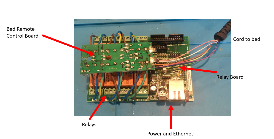 I have a Drive hospital bed which has a controller with 6 momentary switches. my plan is to tap into the remote and connect a relay to each switch. I will write scripts to move head, legs and the whole bed up and down. There are analog inputs on the relay board that I could use somehow to monitor position and create custom positions. right now I have to wait for my son to finish the semester before I can get working on this project. I will certainly post more as I achieve success.